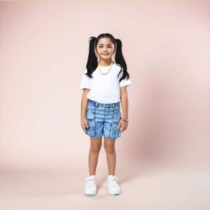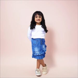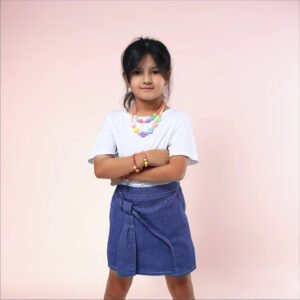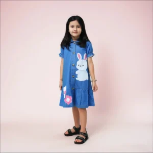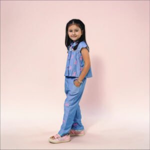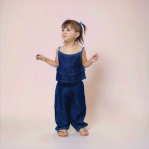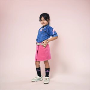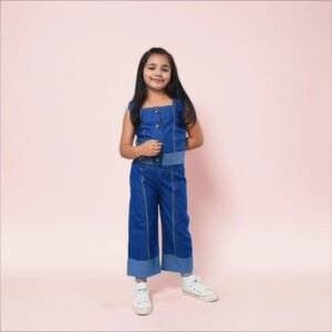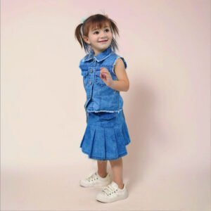 This sleeveless denim dress features a charming blend of polka dots and floral prints in a rich blue hue. Designed with a smart collared neckline and button-down front, it offers both style and comfort. Perfect for casual outings or special occasions, it’s a must-have for your little one’s wardrobe!